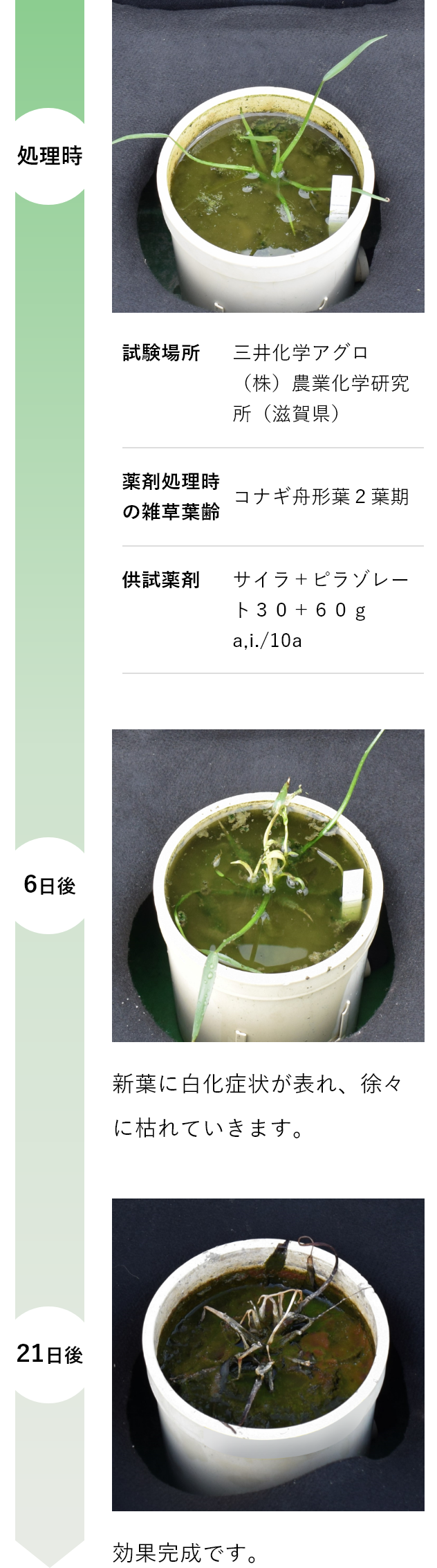 「サイラ」は、水田に発生する広範囲な広葉雑草・カヤツリグサ科雑草に有効な新規除草剤有効成分です。新しい作用機構を有することにより、現在、日本国内の水田で問題となっているオモダカ、コナギ、ミズアオイ、ホタルイなどの抵抗性雑草対策にも役立ちます。 > 有効成分「サイラ」について