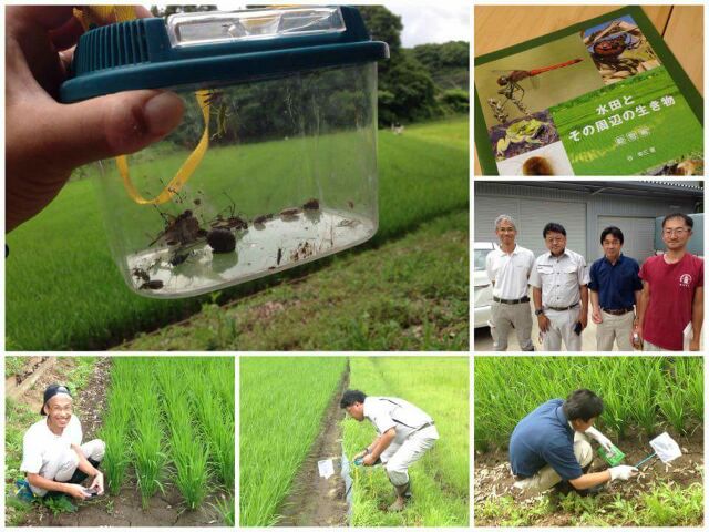 2014年には、田植えから出穂期にかけて3時期(7月中旬、8月中旬、8月下旬~9月上旬)に、福岡県の水田2カ所で、水田環境鑑定士および生物分類技能検定1級者による調査を行いました。